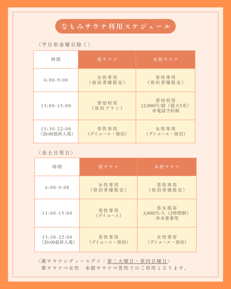 ・ 蔵サウナは、平日・休日祝日ともに 男性専用 となります。