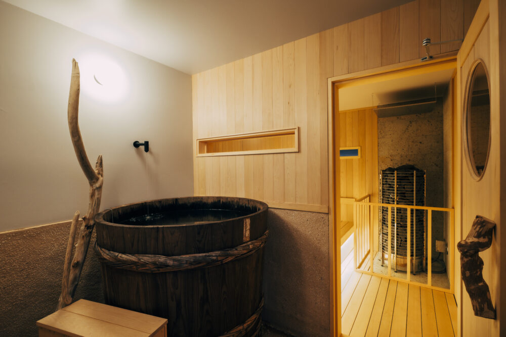 ▼青森ヒバとハーブが香るサウナ室▼特大木樽を使用した滝の頭水風呂